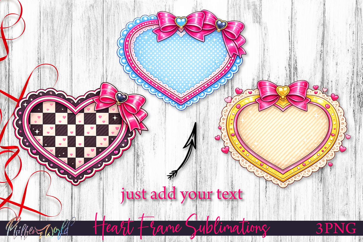 This coquette-style Heart Frame Sublimations feature three romantic heart frames decorated with satin bows, lace edges, and sweet patterned fills. Designed in a soft, feminine aesthetic, these frames are perfect for adding custom text, names, quotes, or messages. Ideal for Valentine’s Day designs, love-themed gifts, mugs, apparel, cards, and other sublimation or print projects.