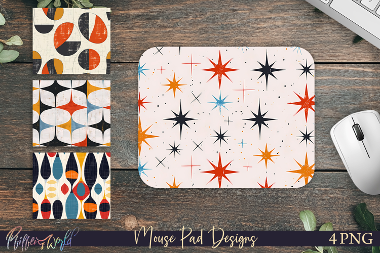 Stylish mid century modern mouse pad designs featuring retro geometric patterns and bold abstract shapes inspired by classic 1950s–1960s design.