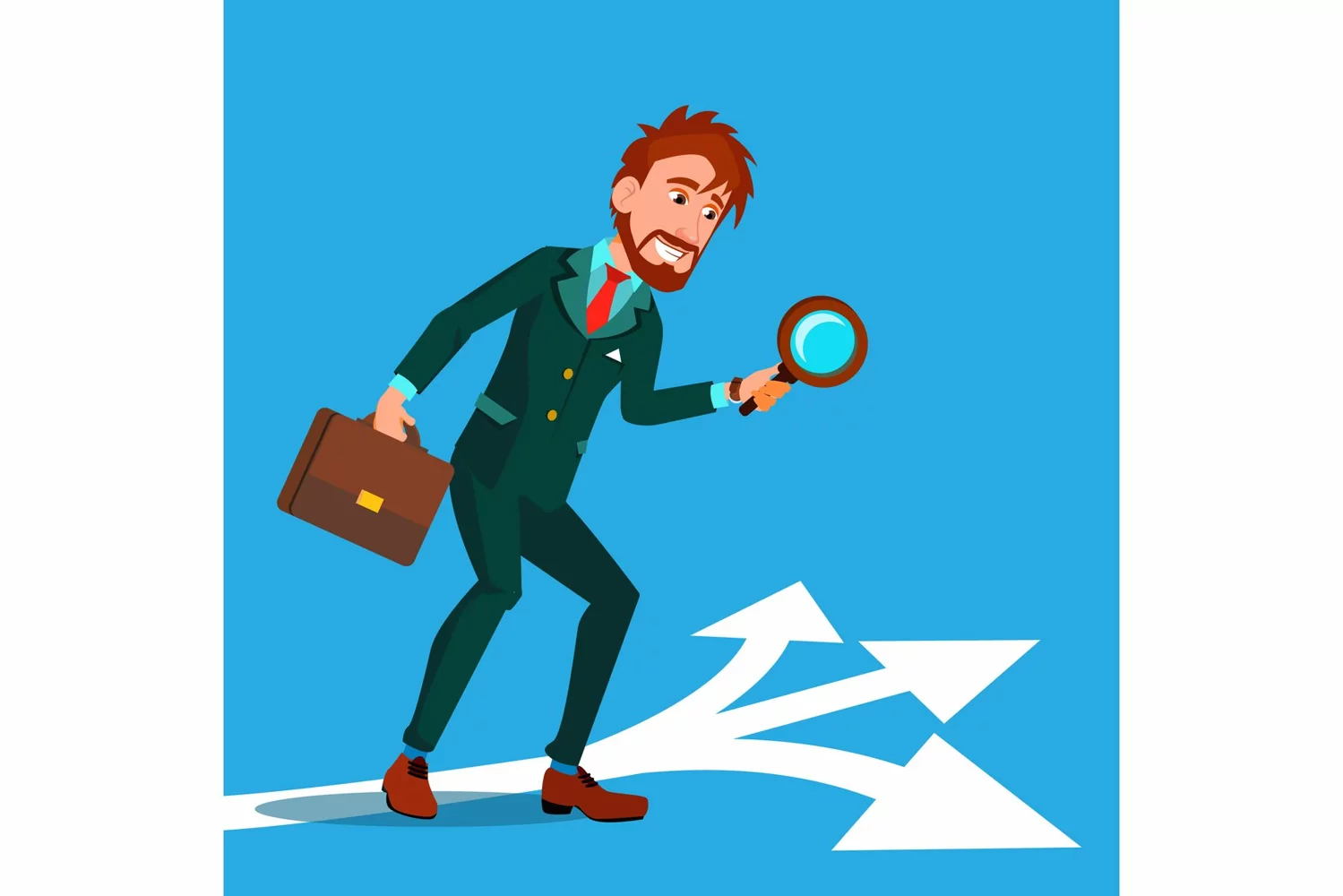 Detective Investigating, Searching Clues Cartoon Vector Character. Man Finding Clues At Crime Scene. Guy Holding Magnifying Glass, Briefcase Drawing. Businessman Choosing Path, Road Flat Illustration