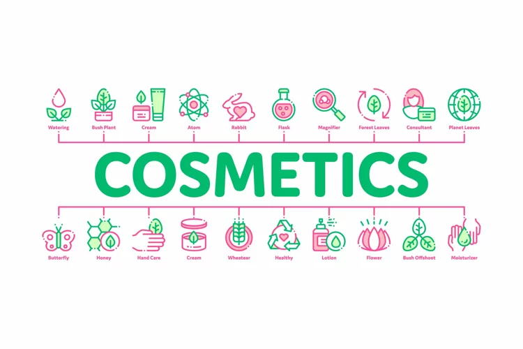 Organic Cosmetics Minimal Infographic Web Banner Vector. Organic Cosmetics, Natural Ingredient Pictograms. Eco-friendly, Cruelty-free Product, Molecular Analysis, Scientific Research Illustration