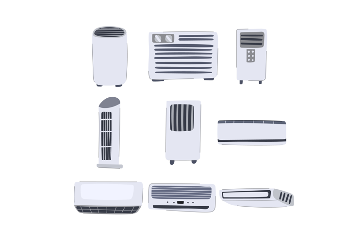 air conditioner set cartoon. thermostat refrigerant, compressor condenser, ductwork ventilation air conditioner sign. isolated symbol vector illustration