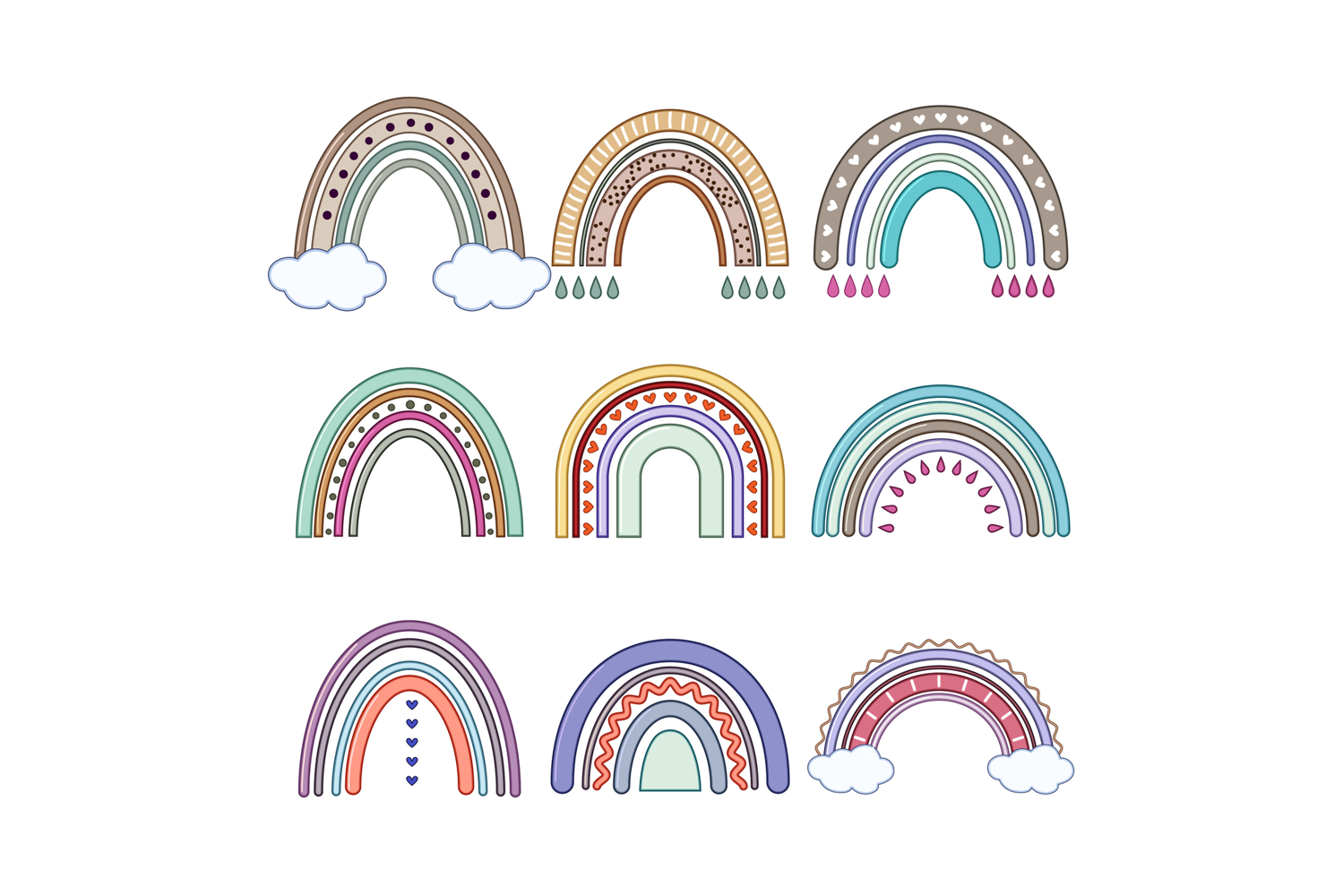 Cute set of nine pastel colored hand drawn rainbow illustrations with decorative clouds, hearts, and raindrops, perfect for nursery designs or children's themes