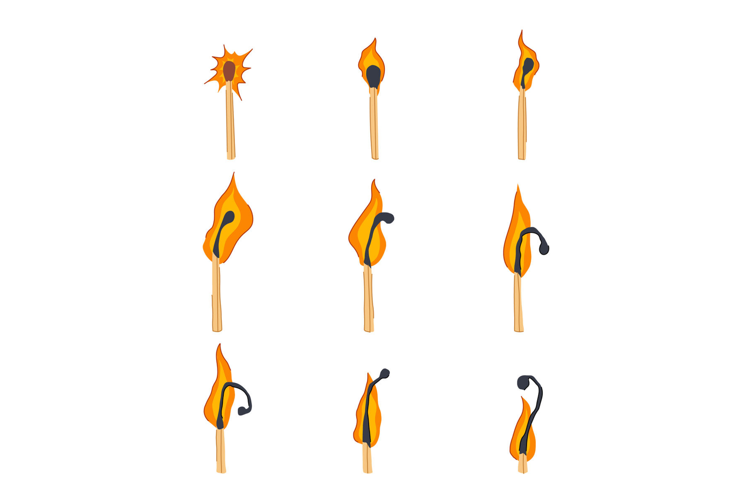 Burning wooden matchstick stages process illustration
