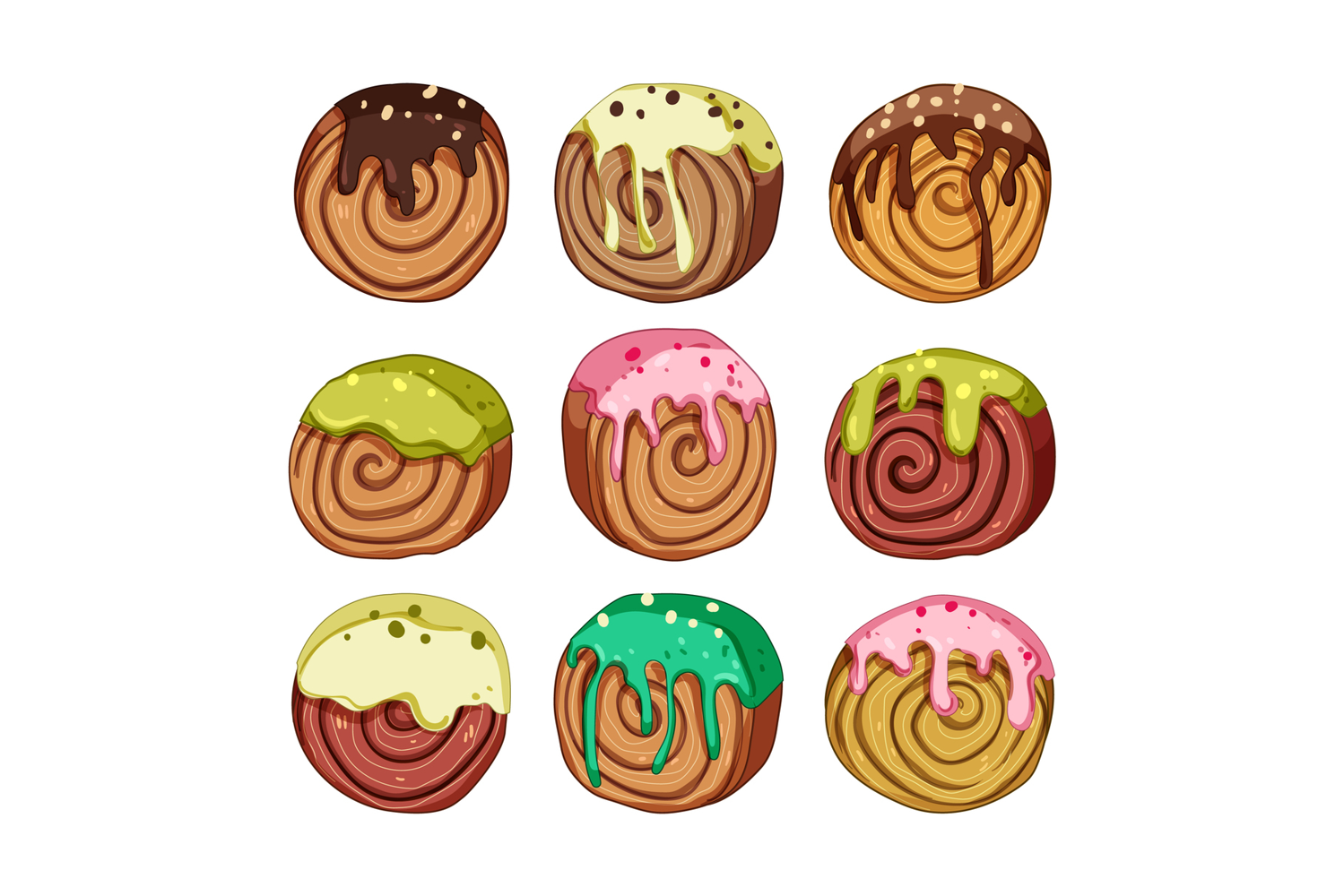 Cromboloni pastries featuring a variety of colorful dripping glazes and decorative sprinkles, showcasing a delicious collection of popular sweet desserts in a vibrant cartoon style illustration