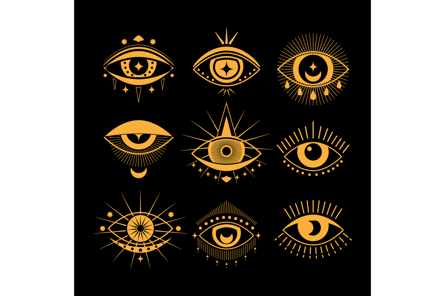 Eye symbols in a mystical golden design on a black background, representing concepts of insight, third eye awakening, protective vision, and spiritual astrology