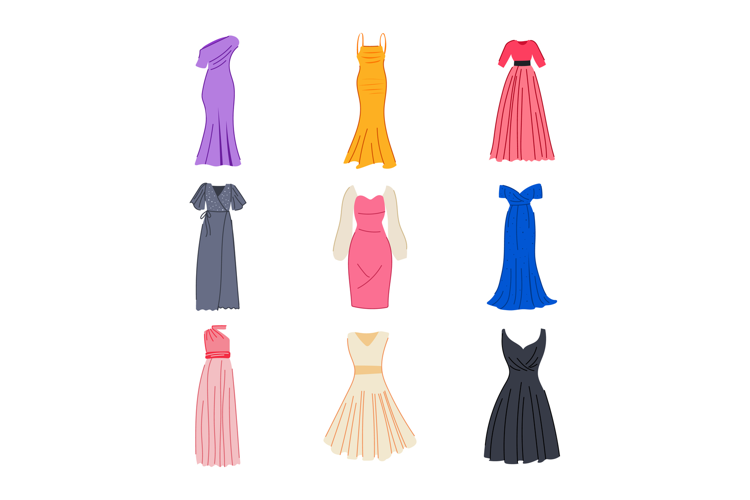 evening dress set cartoon. woman model, girl beauty, glamour style evening dress sign. isolated symbol vector illustration