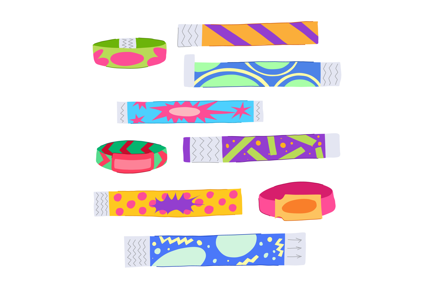 event bracelet set cartoon. concert party, admission vip, security souvenir event bracelet sign. isolated symbol vector illustration