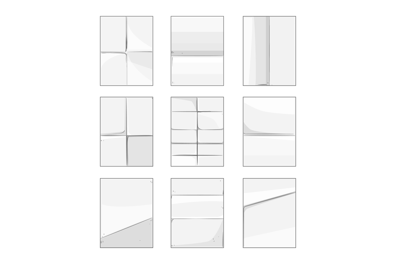 White paper sheets featuring different crease patterns and texture effects, creating useful blank templates for graphic design, communication, document, and note concepts