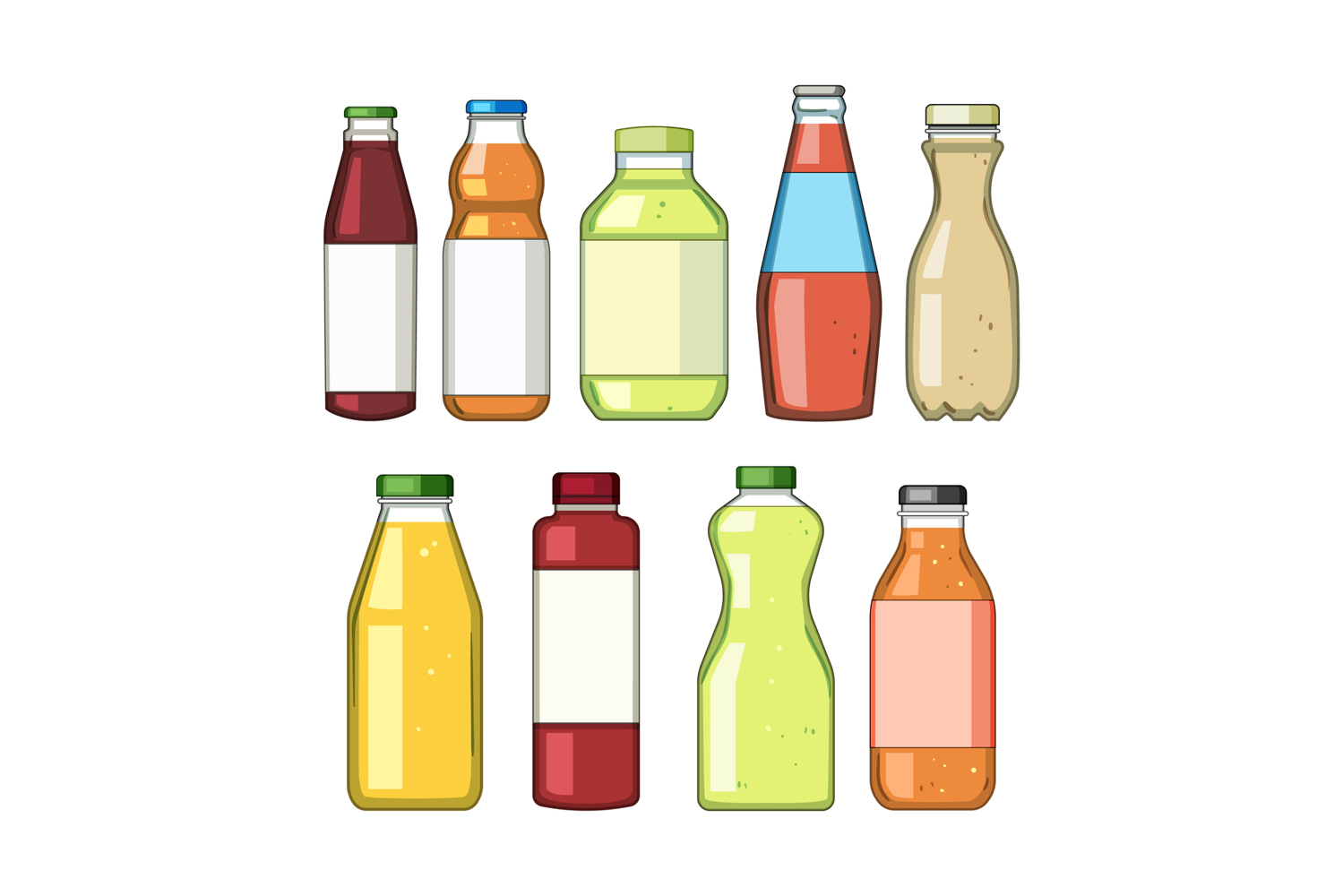 Collection of various bottles presenting different colored liquids and blank labels, representing a diverse range of healthy fruit juices, smoothies, and other nutritious drinks