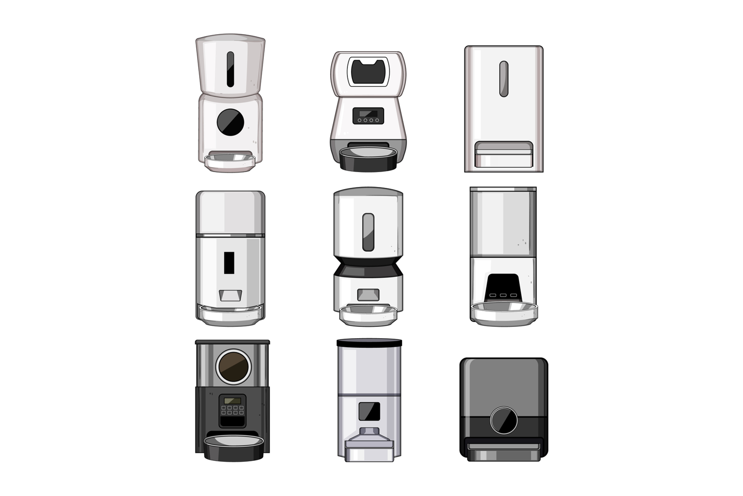Collection of various automatic pet feeders representing modern smart devices for pet care, delivering convenience and scheduled feeding solutions for cats and dogs