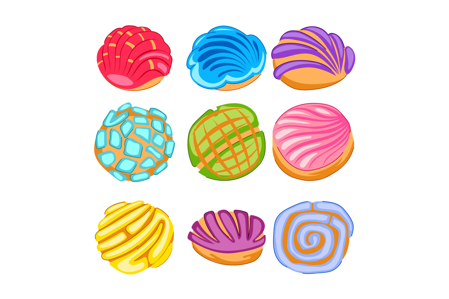 Mexican sweet concha bread collection colorful illustration