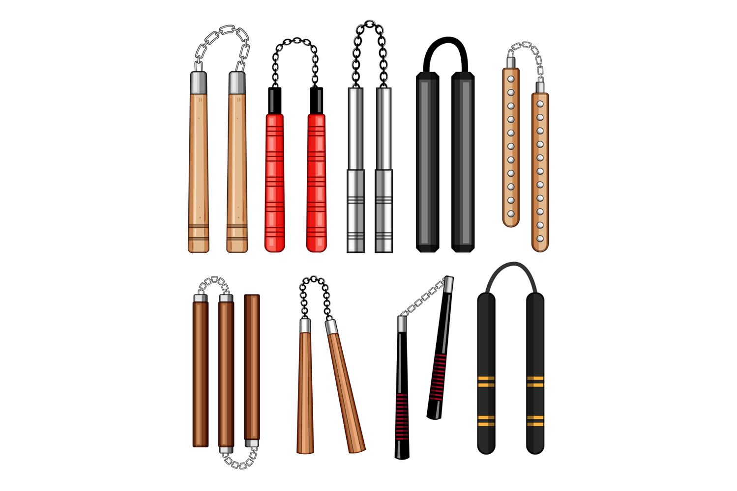 Set of nunchaku weapons showing various types, materials and designswood, metal, foam and chain connected sticks for martial arts training, self defense and practice