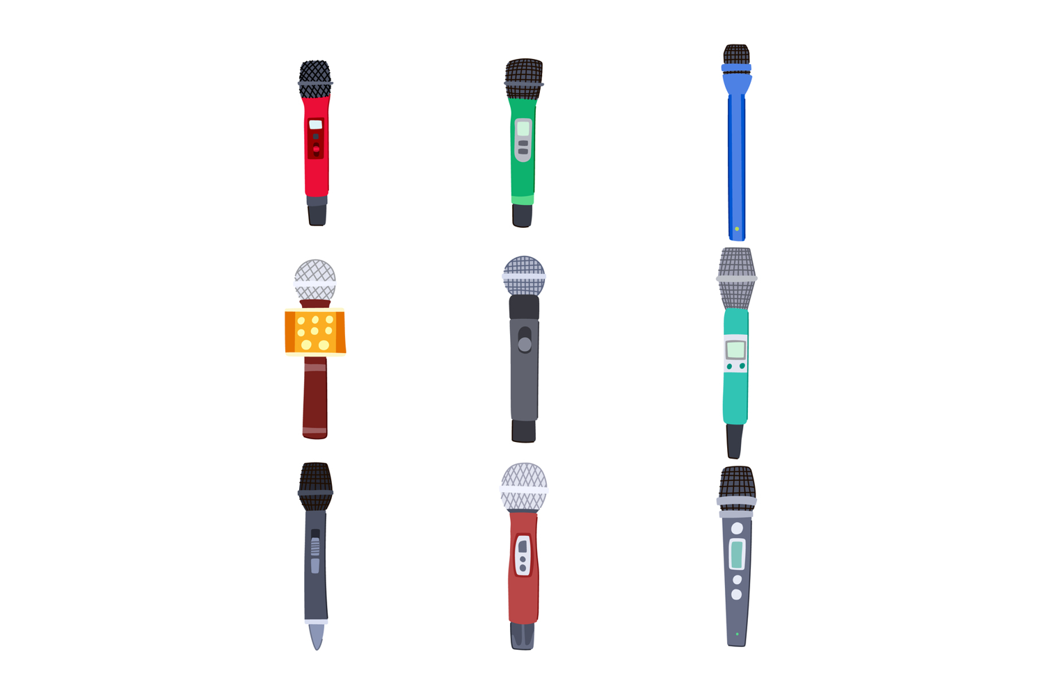 radio microphone set cartoon. cardioid omnidirectional, handheld shotgun, boom diaphragm radio microphone sign. isolated symbol vector illustration