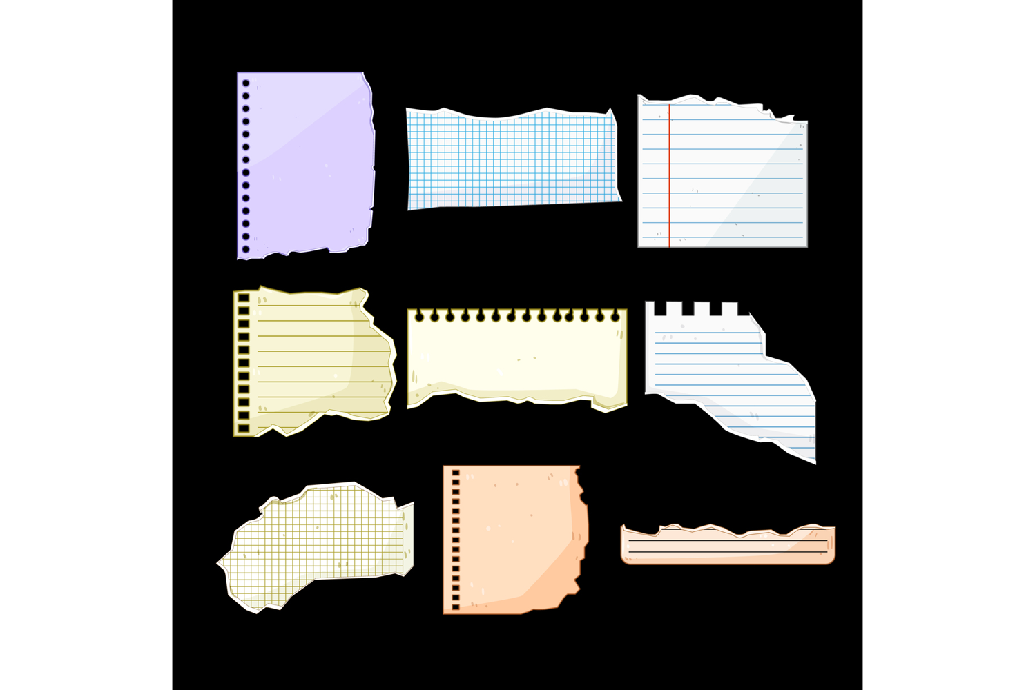 Set of various paper scraps, including lined, grid, and plain texture, cut from notebooks, providing blank space for notes, messages, reminders, or creative design elements