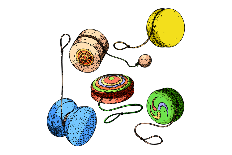 yo yo set hand drawn. spin string, loop axle, responsive unresponsive yo yo vector sketch. isolated color illustration