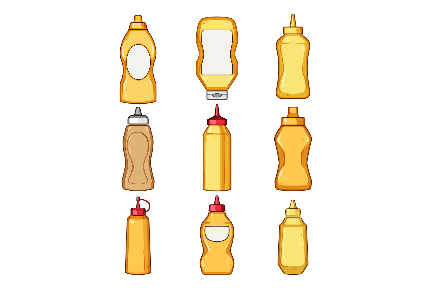 Collection of various stylized squirt bottles and dispensing containers with blank labels, perfect for showcasing different condiment packaging designs