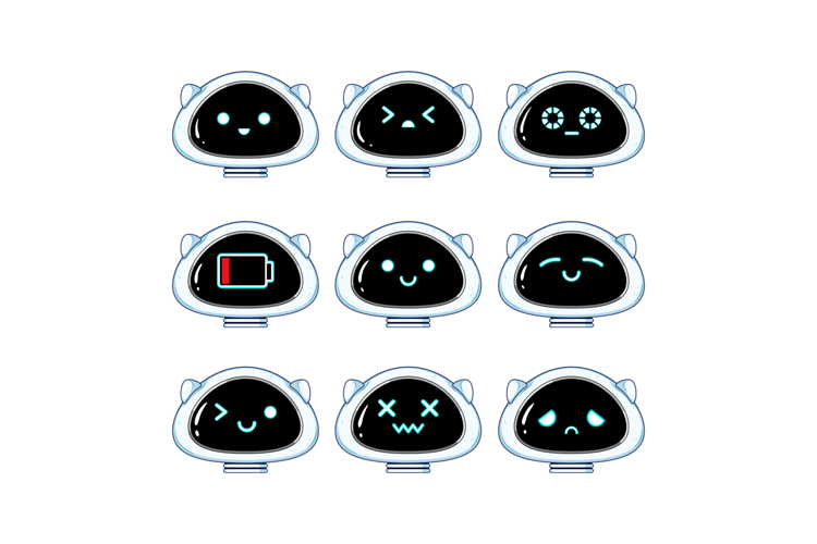 Cute robot heads displaying various emotions and expressions