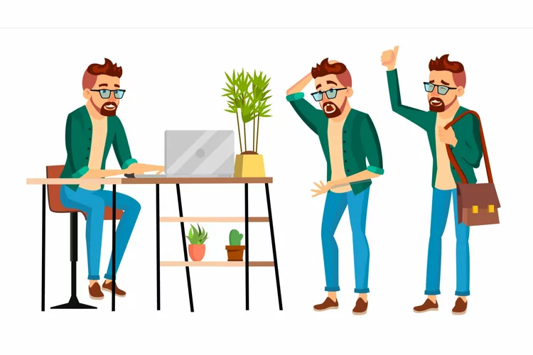 Business Man Character Vector. Hipster Working Man. Environment Process Creative Studio. Male Worker. Full Length. Designer, Manager. Poses, Face Emotions, Gestures. Cartoon Business Illustration