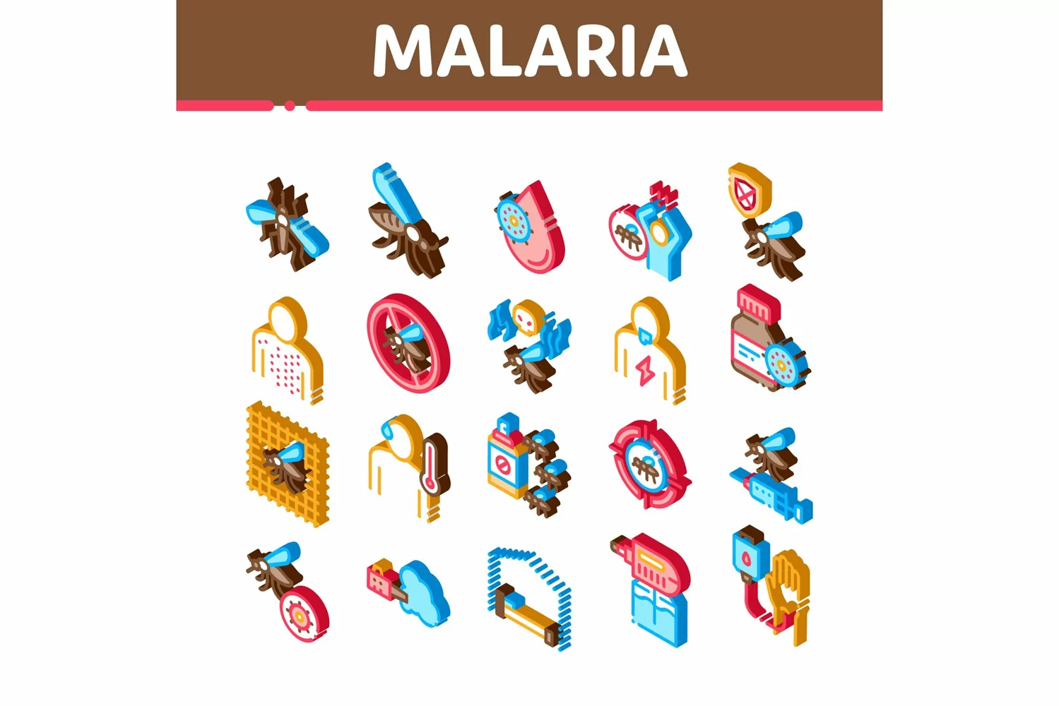 Malaria Illness Dengue Icons Set Vector. Isometric Malaria Mosquito, Spray And Protect Cream Bottle, Sick Human And Treatment Illustrations