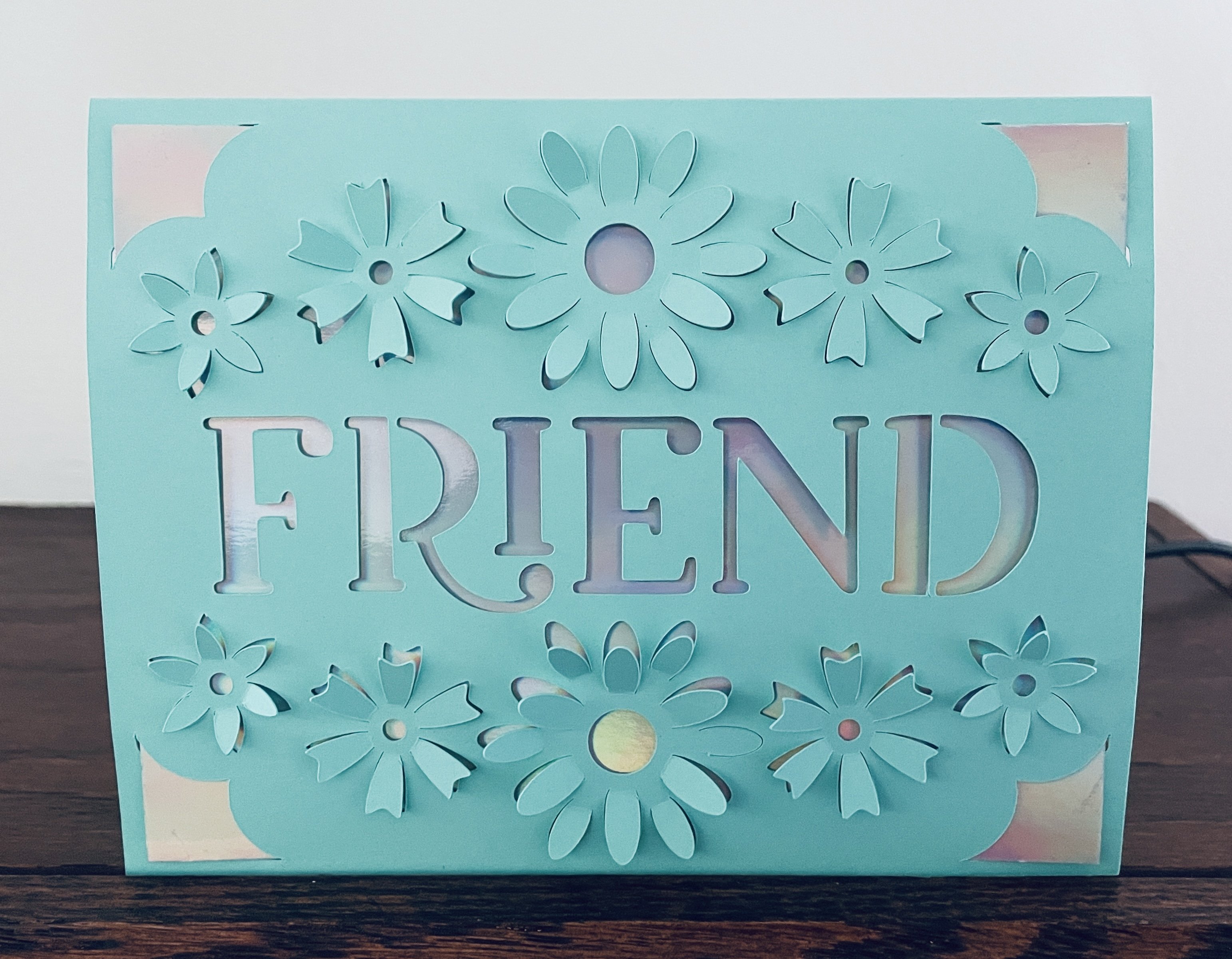 The centre of the card has the word FRIEND cut out and surrounding this word are several pop up flowers. The petals of these flowers will stay attached to the card and you can 'pop' them out to create a 3d effect. It's a very pretty card.