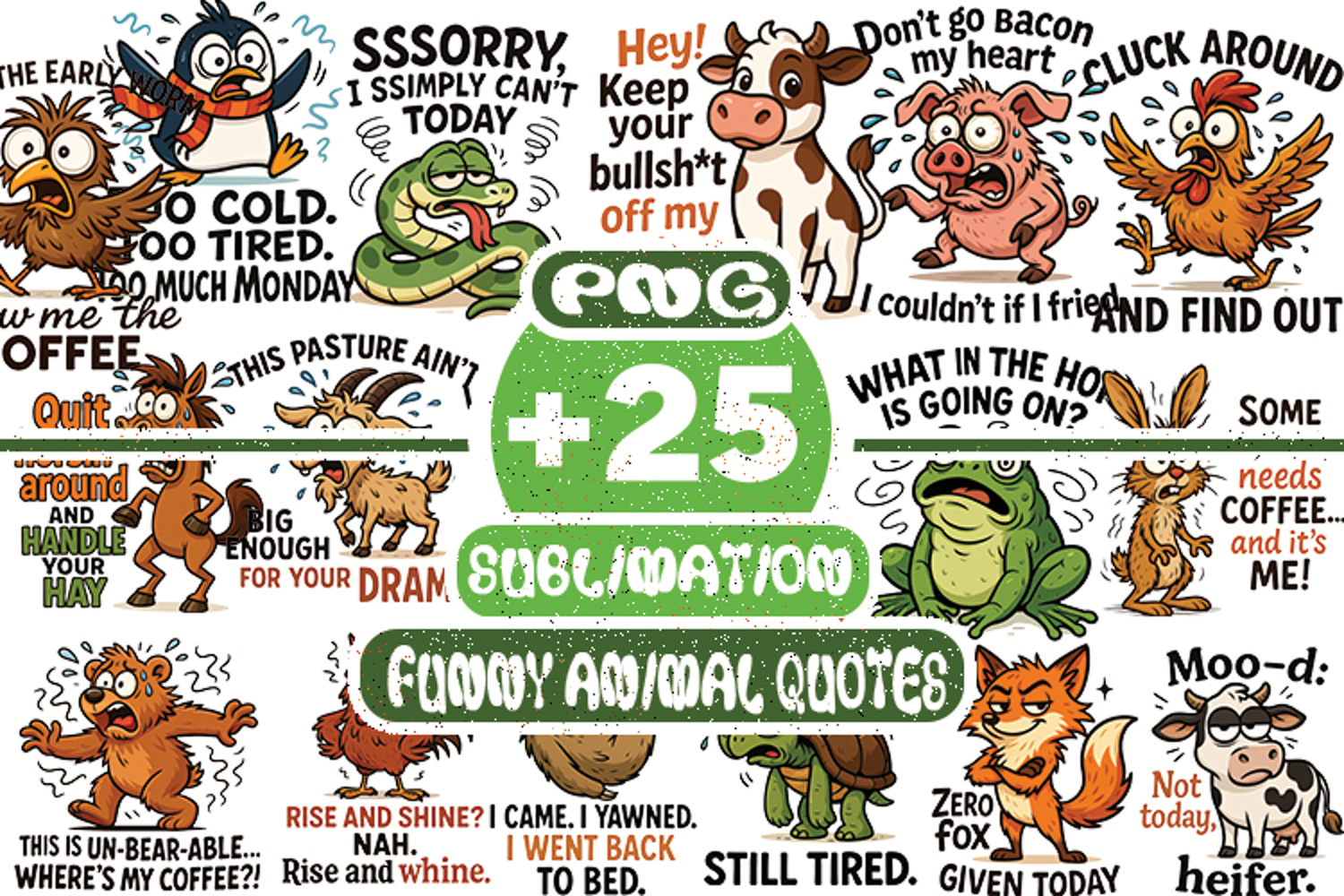 Bring laughter to your crafts with this Funny Animal Quotes Sublimation Bundle! Featuring hilarious sayings paired with farm animals and pets, this set is perfect for t-shirts, mugs, tote bags, wall art, and more. A must-have for animal lovers with a sense of humor!