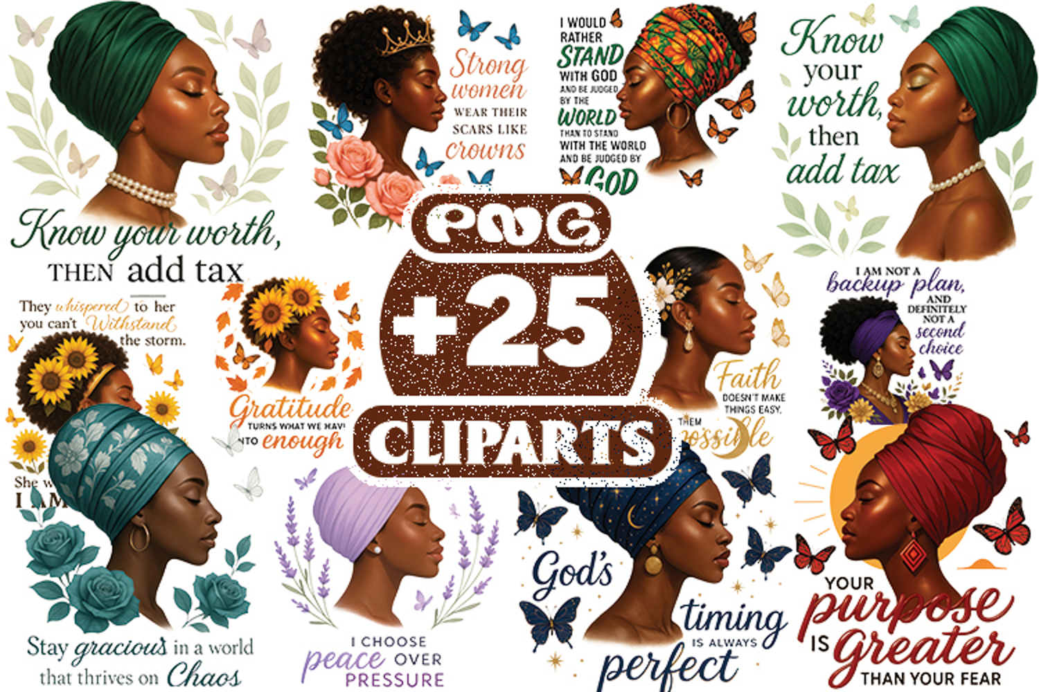 Bring empowerment and style to your creations with this Inspirational Afro Women Quotes Clipart Bundle – perfect for anyone who loves art with a message. 🌟