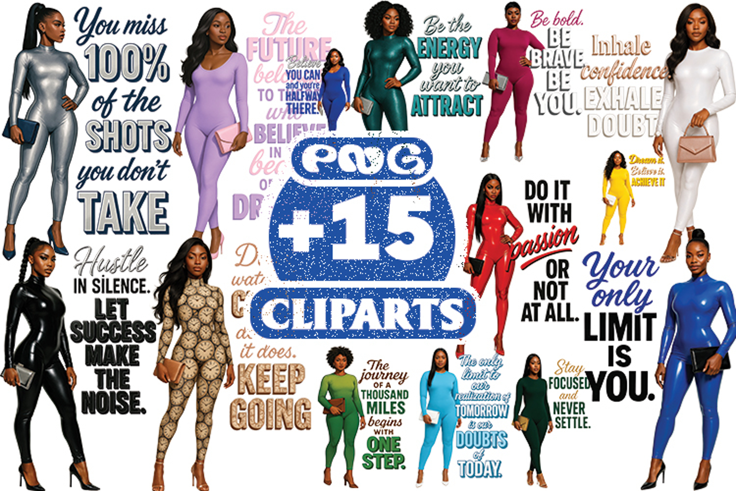 Celebrate confidence, beauty, and empowerment with this Black Woman Curvy Fashion Poses Quotes Clipart set. Featuring stunning plus size Afrocentric fashion illustrations with inspiring quotes, this bundle is perfect for sublimation, T-shirts, mugs, tote bags, stickers, and wall art.