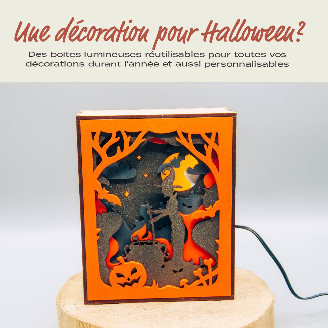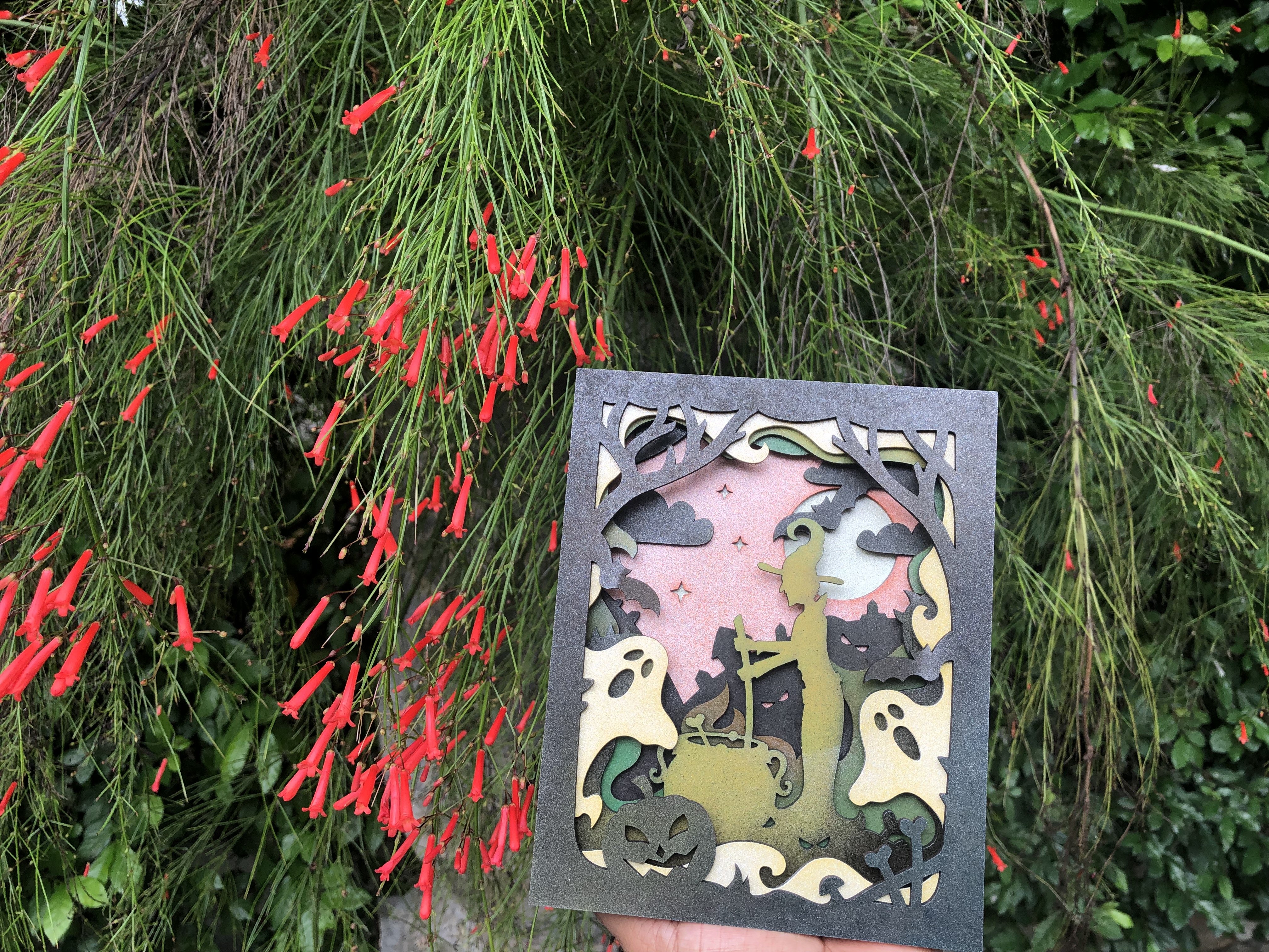 Halloween Wall Art 3D Layered SVG Cut File Shadowbox - Halloween Decorative Wall Art/Sculpture - Witch, ghost, pumpkin, bones, moon, trees, all composing a Halloween scene.
