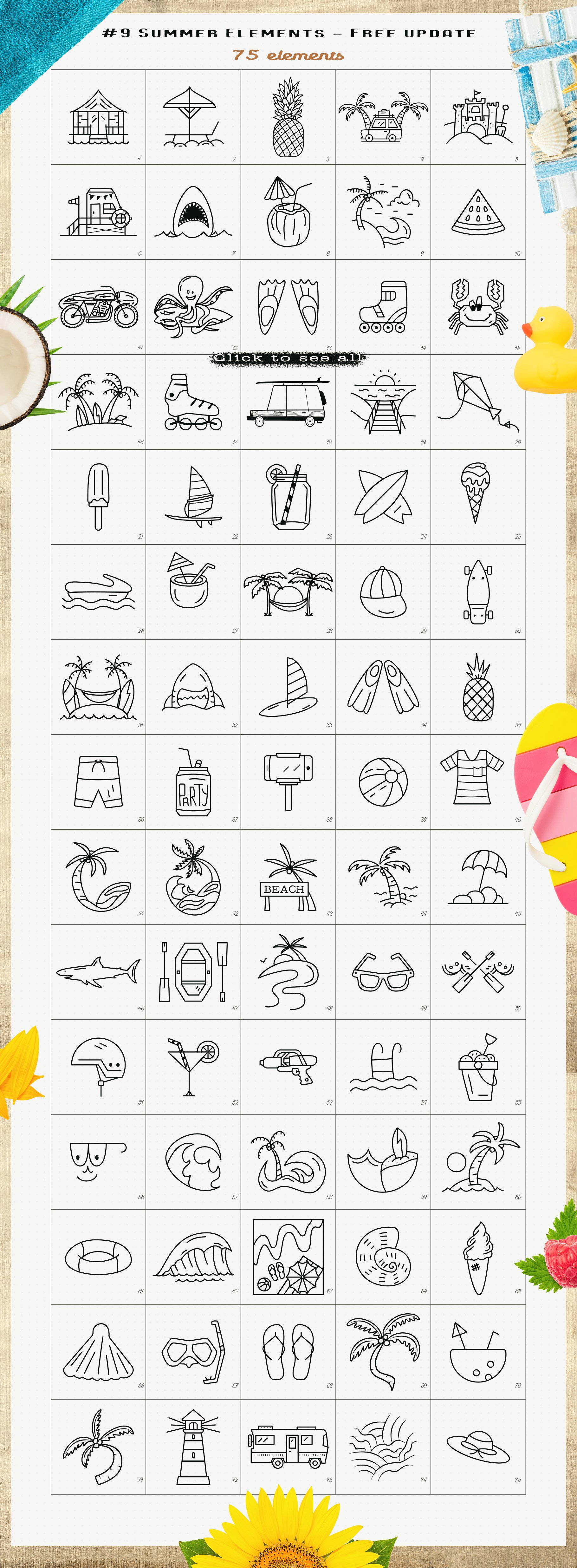 A set of isolated summer items: towel, hat, leaf, sunflower, slippers, sand, summer box, sand bucket, sand rake, coconut, toy shovel, lighthouse decoration, coral, sand toys, vintage box, flower, petal, suglasses, rubber duck, wooden decoration, compass, raspberry, rose petal, wooden heart, etc.