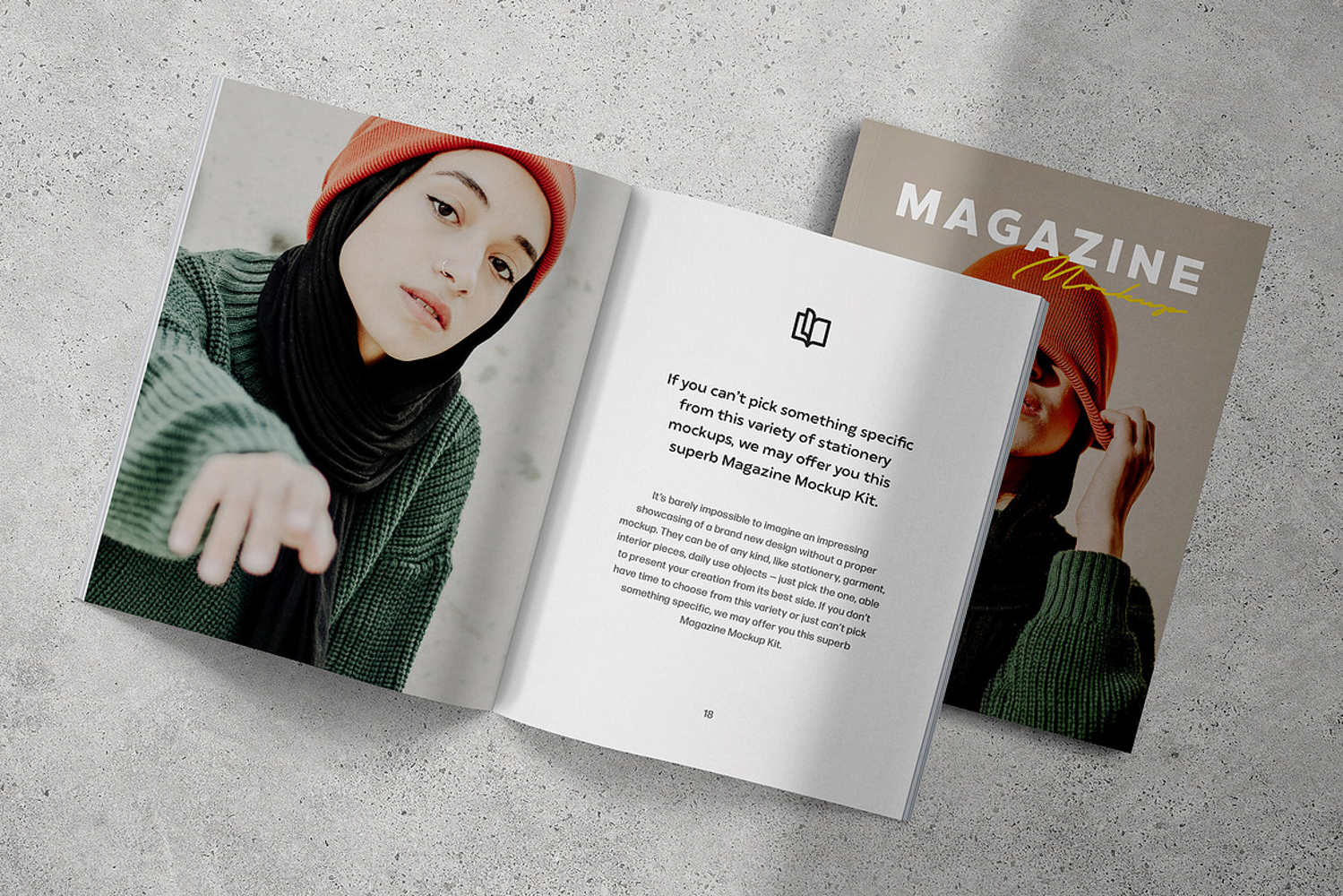 The jaw-dropping presentation shots are just a couple of clicks away! Get this magazine mockup scene to check it out easily, by crafting inspiring shots everyone will adore. Simply open the Smart Object Layer to insert your graphics, then don't forget to save the file in order to keep the progress. The spread and cover parts can have different designs in them as well, while the scene is decorated with shadow overlay. This mockup is great for any project that relies on photography and stylish visuals!