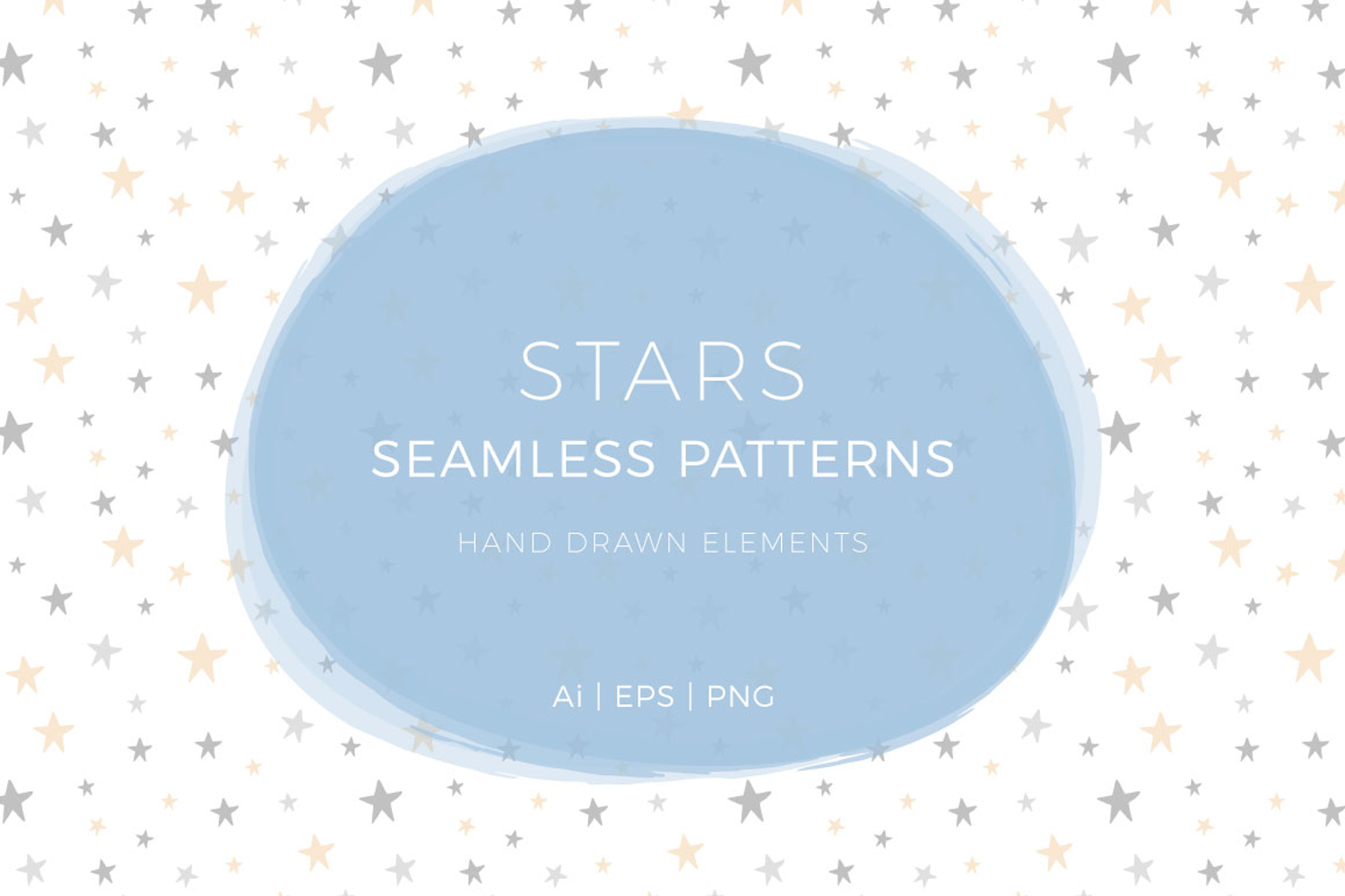 Collection of elegant seamless patterns with hand drawn stars (4 patterns, two colors palettes for each pattern).