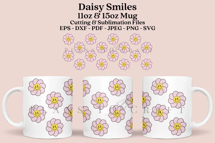 Daisy Smiles template for glass mug 11oz and 15oz full wrap, SVG, PNG, JPG, PDF, DXF, EPS for Cricut, Silhouette, and sublimation.