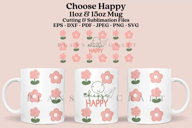 Choose Happy template for glass mug 11oz and 15oz full wrap, SVG, PNG, JPG, PDF, DXF, EPS for Cricut, Silhouette, and sublimation.