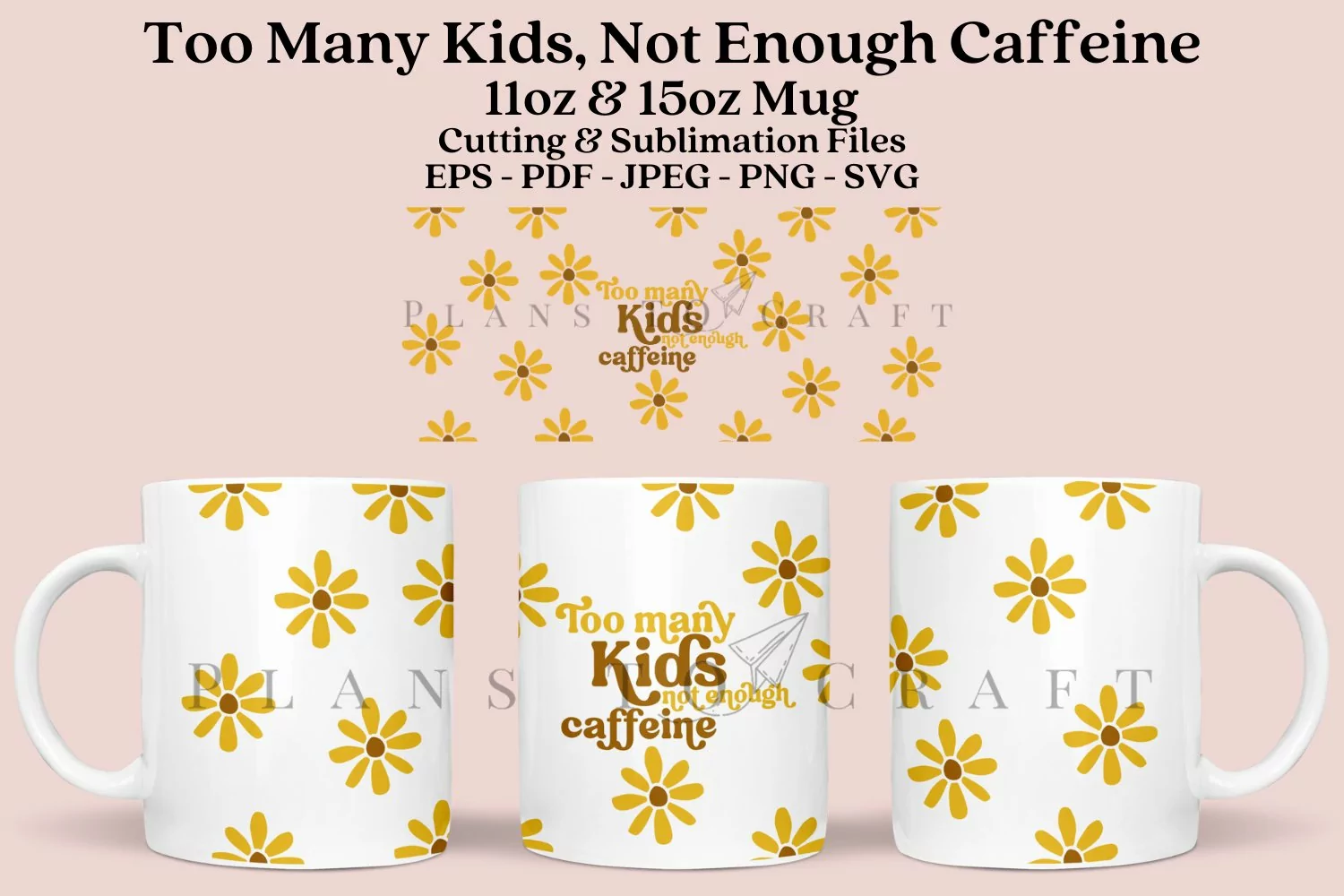 Too Many kids not Enough Caffeine template for glass mug 11oz and 15oz full wrap, SVG, PNG, JPG, PDF, DXF, EPS for Cricut, Silhouette, and sublimation.