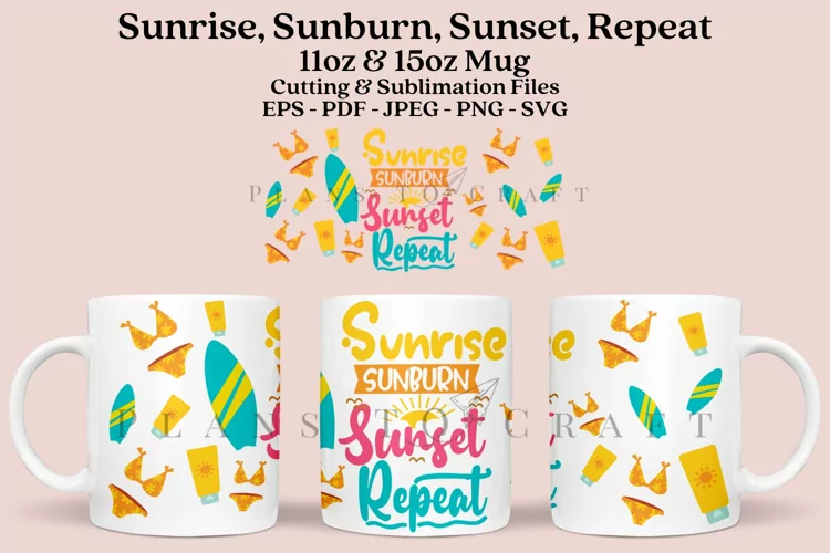 Sunrise, Sunburn, Sunset Summer template for glass mug 11oz and 15oz full wrap, SVG, PNG, JPG, PDF, DXF, EPS for Cricut, Silhouette, and sublimation.