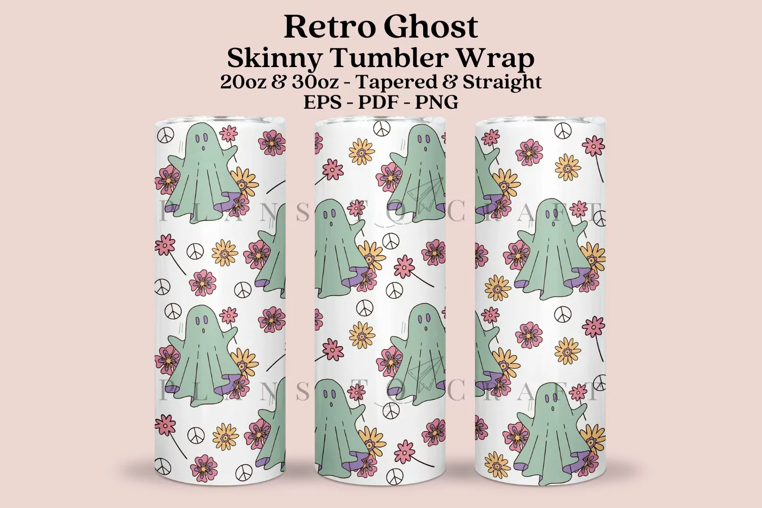 Retro Ghost Halloween skinny tumbler sublimation wrap, for 20oz and 30oz straight and tapered skinny tumbler.