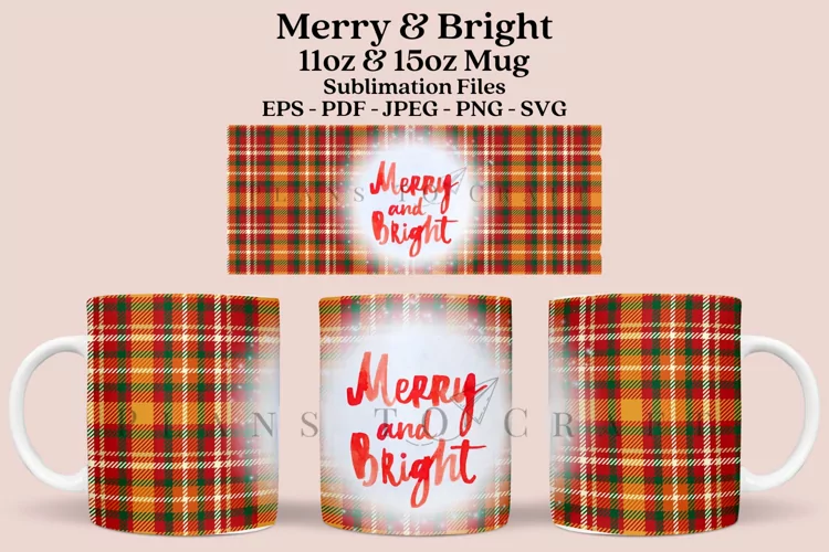 Merry & Bright christmas glass mug 11oz and 15oz full wrap, SVG, PNG, JPG, PDF, DXF, EPS for Cricut, Silhouette, and sublimation.