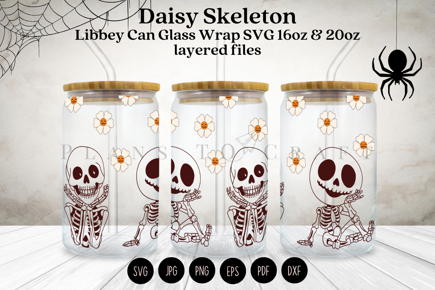 Daisy Skeleton halloween beer glass can full wrap for Libbey Glass 16oz and 20oz PNG, DXF, SVG, JPG, EPS, PDF for Cricut and Silhouette, digital download.Features: