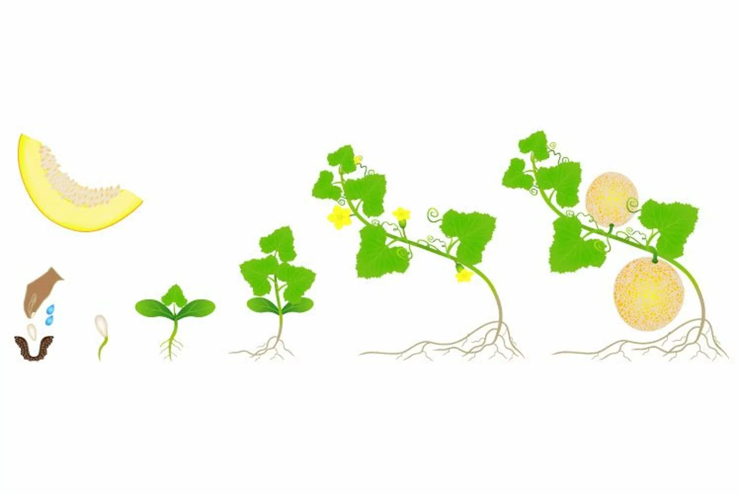 Cycle of growth of a plant of a yellow melon isolated on a white background.