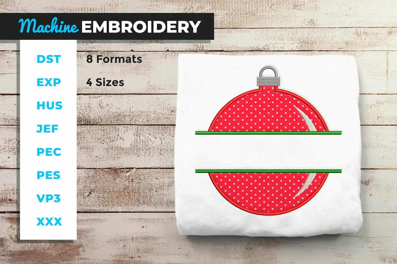 Get into the holiday spirit with this beautiful ornament applique design. Includes a split in the middle for adding your own text. (Text not included).