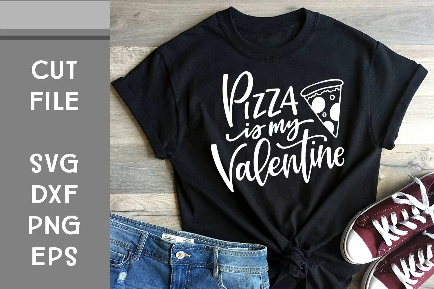 This is a hand lettered cut file. It reads, "Pizza is My Valentine." It's decorated with a slice of pizza.