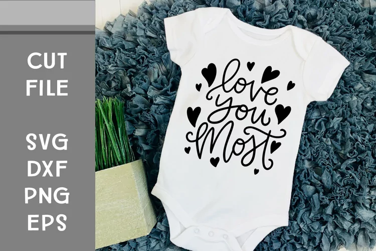 This is a hand lettered cut file. It reads, "Love You Most." It's decorated with hearts.