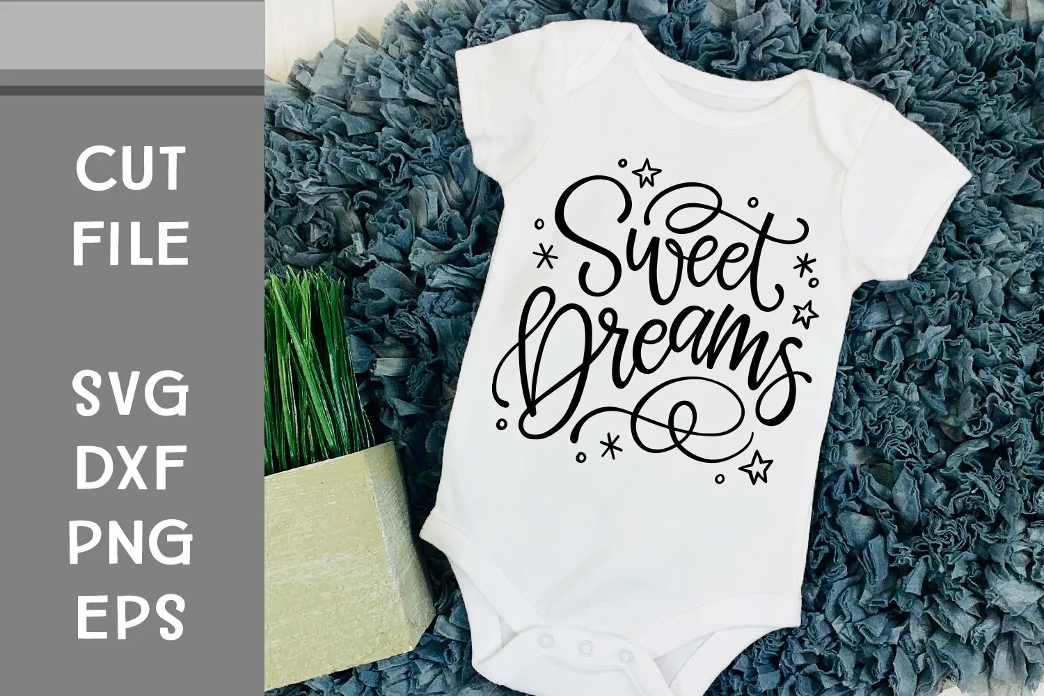 This is a hand lettered cut file. It reads, "Sweet Dreams." It's decorated with a flourish, and stars.