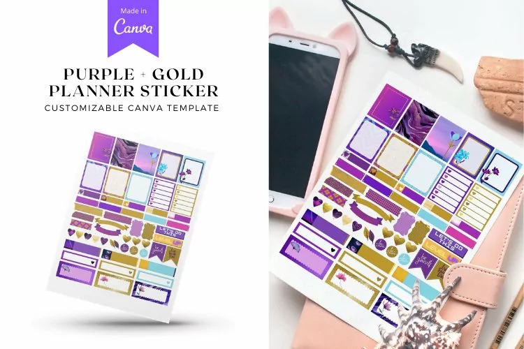 Purple and Gold Planner Stickers Canva Template, Customizabl