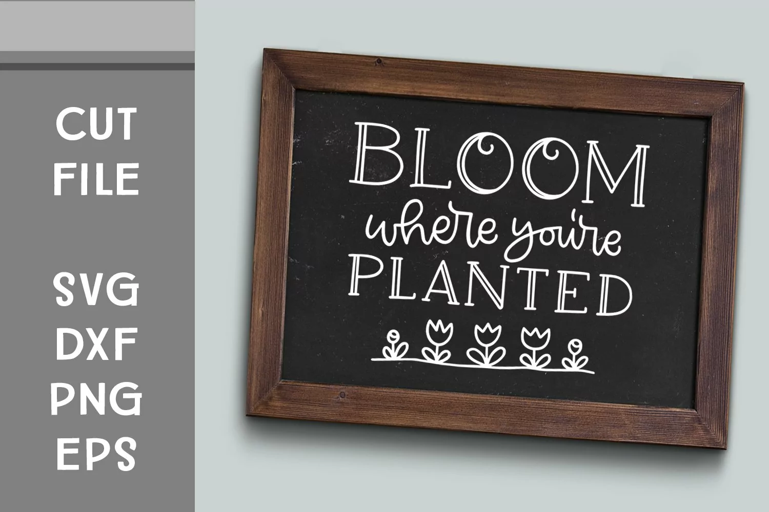 This is a hand lettered cut file. It reads, "Bloom Where You're Planted." It is decorated with flower doodles.