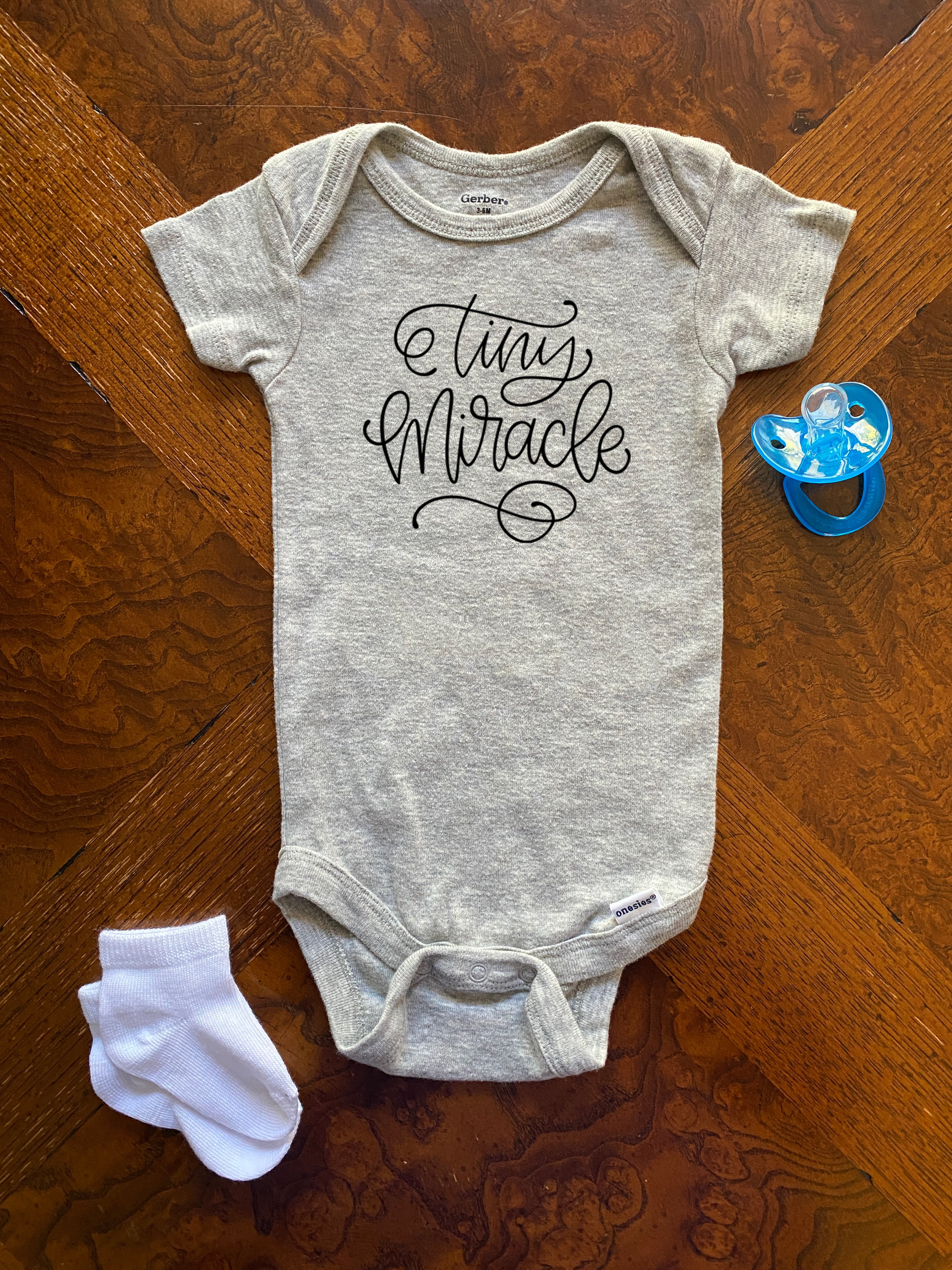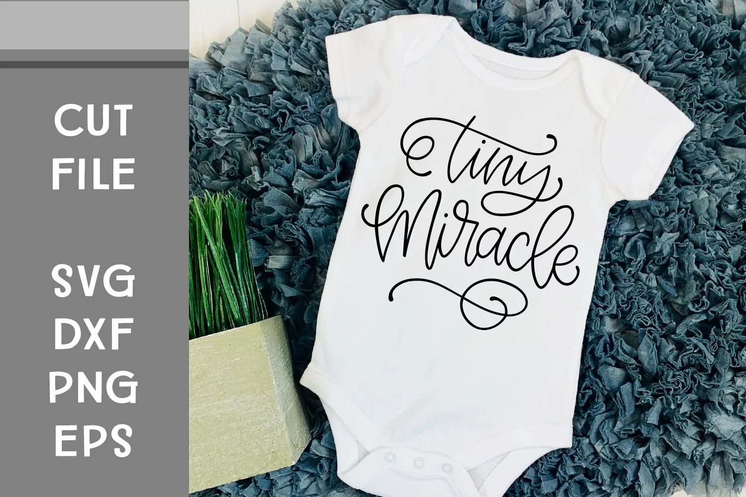 This is a hand lettered cut file. It reads, "Tiny Miracle." It's decorated with a flourish.