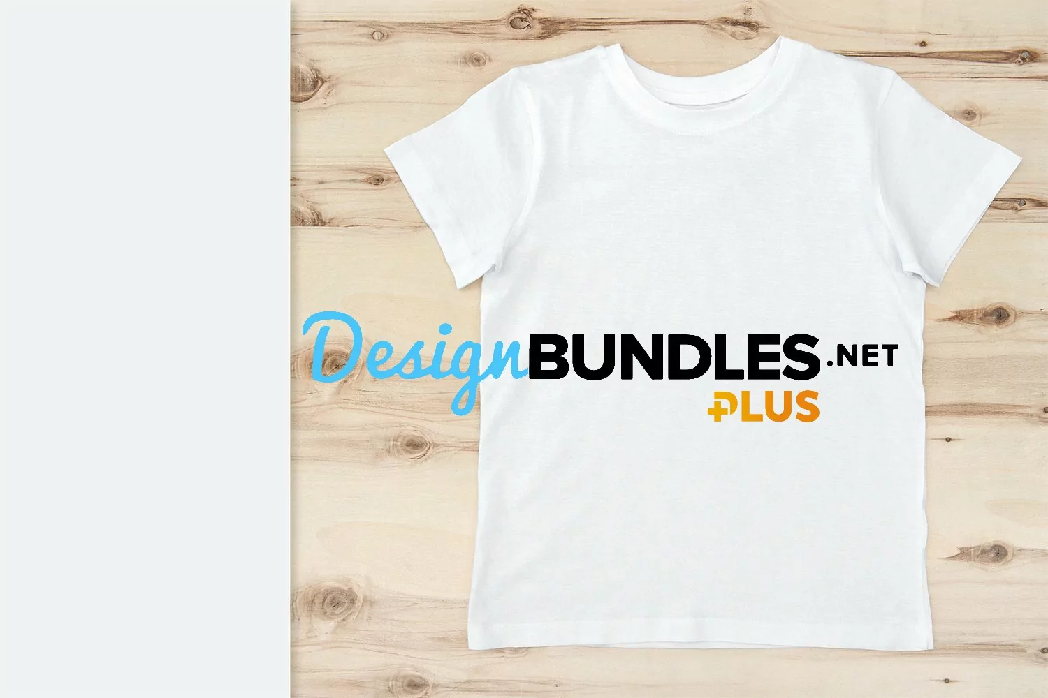 T-Shirt mockup white empty blank plain on wooden background with border