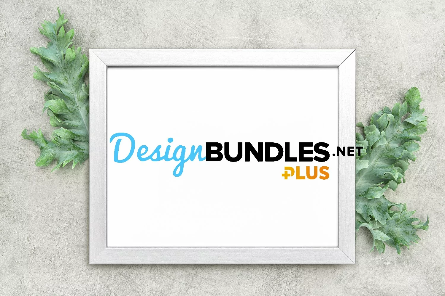 Frame mockup with green leaves on grey background