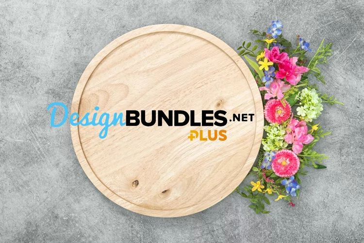 Wooden plate mockup for design with flower decoration Stock photo