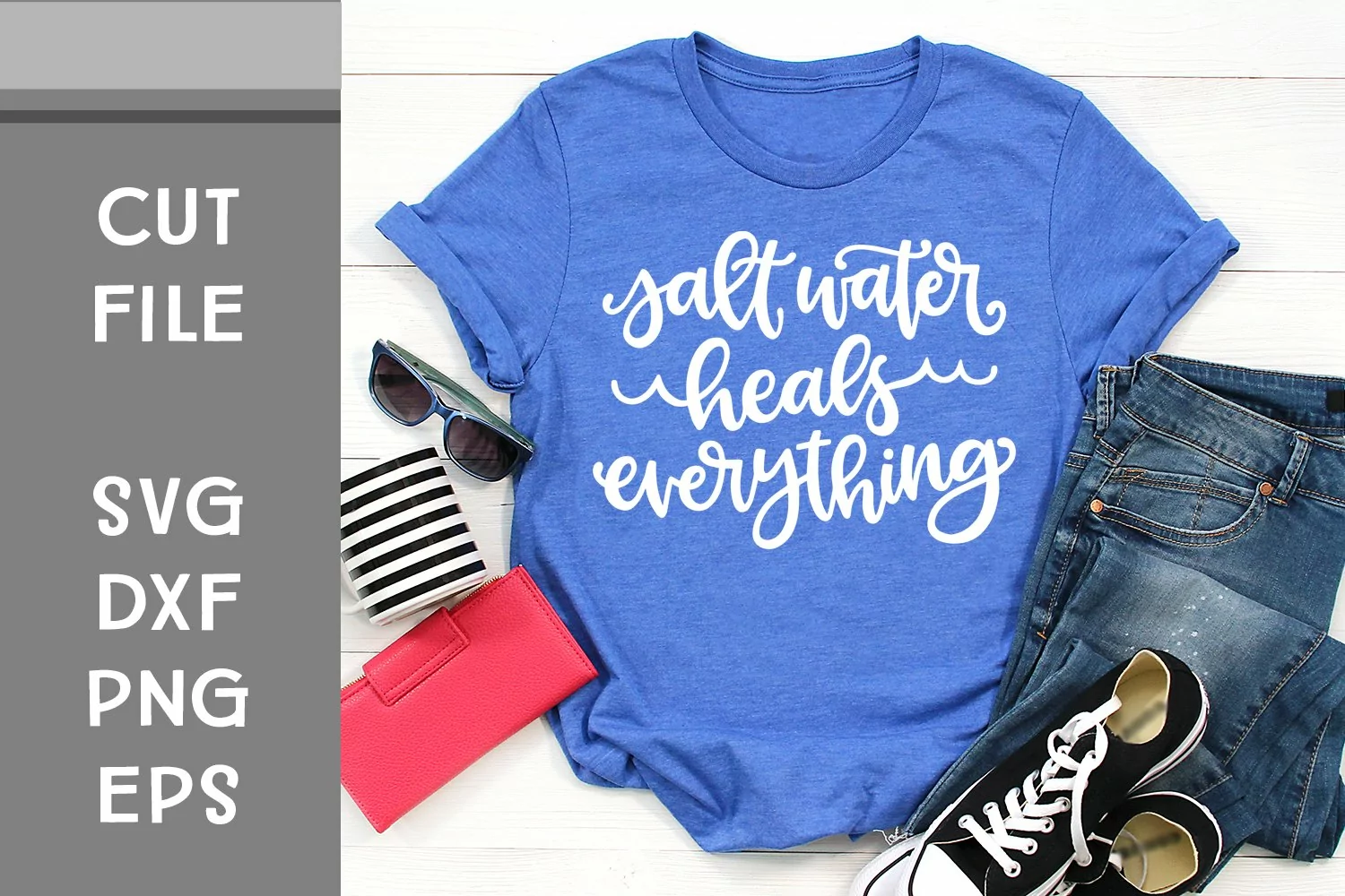 This is a hand lettered cut file. It reads, "Salt Water Heals Everything." It's decorated with little ocean waves.